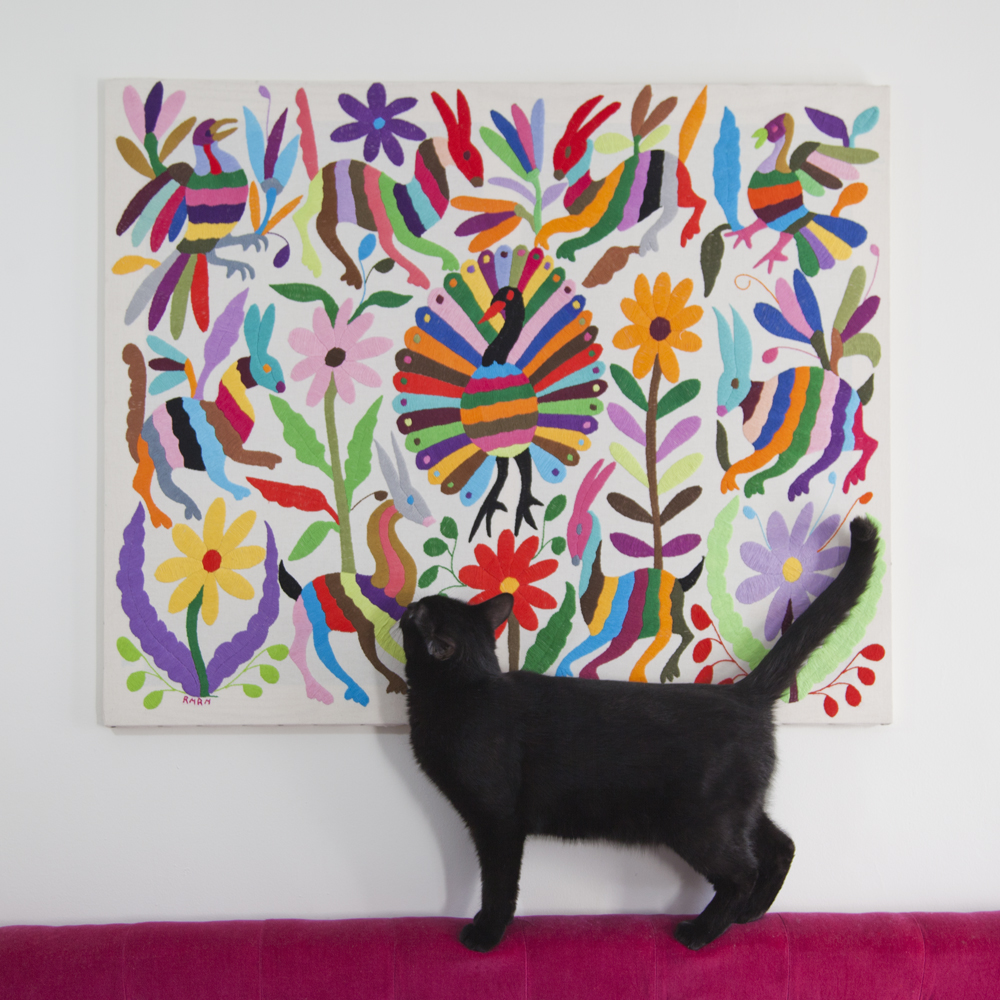 Un tableau unique haut en couleur, idéal pour décorer votre chambre ou votre salon. Le tenango ou tissu dessiné est brodé entièrement à la main par des femmes indiennes originaire de la Sierra Otomi-Tepehua dans l’État d’Hidalgo au Mexique. Les dessins sont uniques et parlent de connaissance et de sagesse, de la relation avec la nature et le cosmos. Le tissu est tendu et cloué sur un châssis de tableau. Les artistes de tenangos illustrent souvent leur environnement et leur imaginaire : des plantes et des « Alebrijes ».